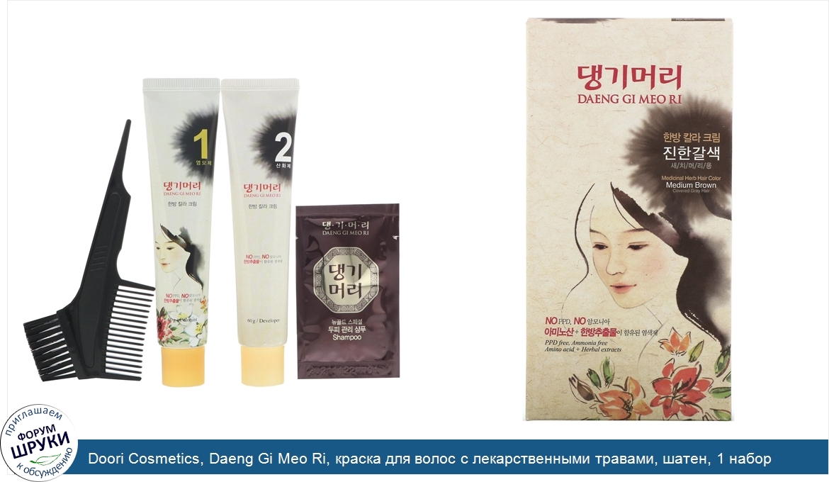 Друзья, если у вас есть отзыв/дополнение/комментарий/вопрос относительно Doori Cosmetics, Daeng Gi Meo Ri, краска для волос с лекарственными травами, шатен, 1 набор - напишите его ответом в эту тему (это будет полезно всему сообществу в целом и вам в отдельности).