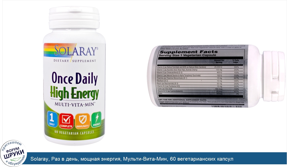 Друзья, если у вас есть отзыв/дополнение/комментарий/вопрос относительно Solaray, Раз в день, мощная энергия, Мульти-Вита-Мин, 60 вегетарианских капсул - напишите его ответом в эту тему (это будет полезно всему сообществу в целом и вам в отдельности).