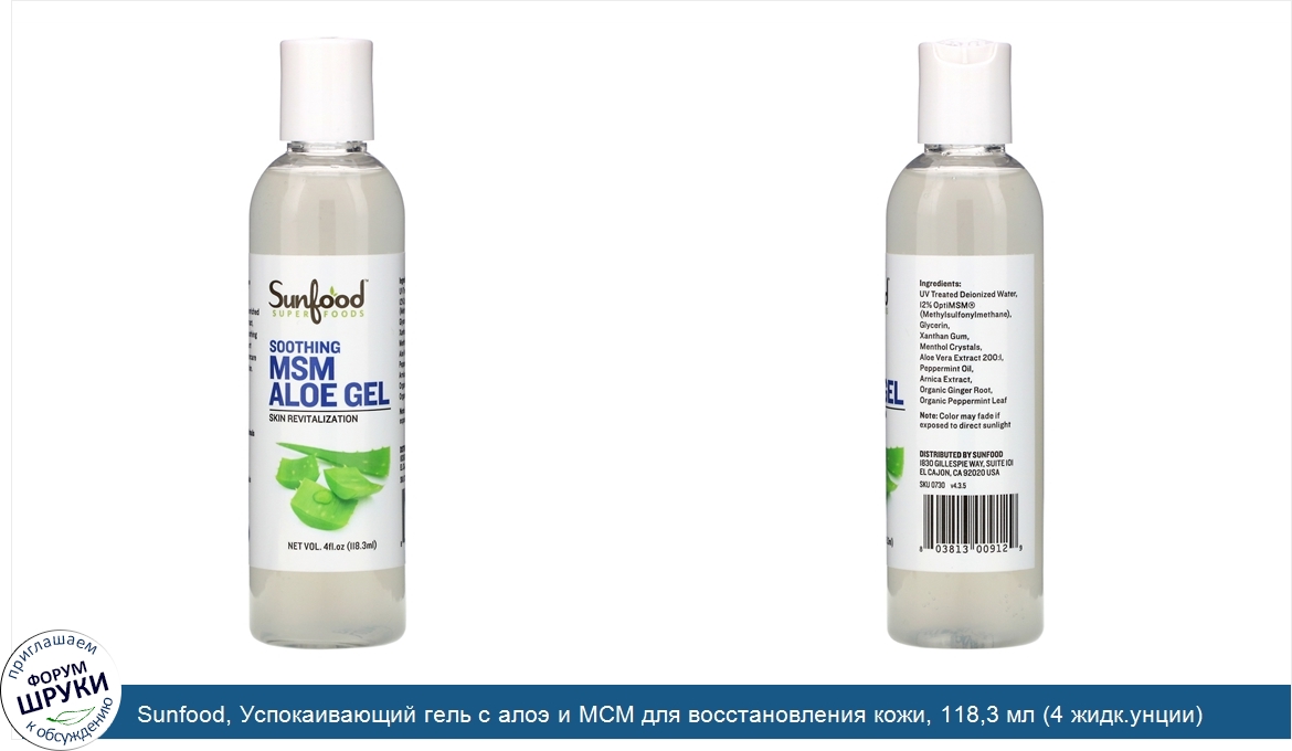 Друзья, если у вас есть отзыв/дополнение/комментарий/вопрос относительно Sunfood, Успокаивающий гель с алоэ и МСМ для восстановления кожи, 118,3 мл (4 жидк.унции) - напишите его ответом в эту тему (это будет полезно всему сообществу в целом и вам в отдельности).