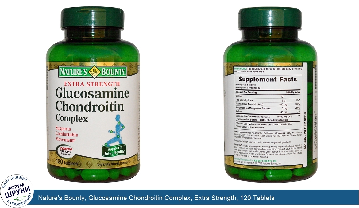 Друзья, если у вас есть отзыв/дополнение/комментарий/вопрос относительно Nature's Bounty, Glucosamine Chondroitin Complex, Extra Strength, 120 Tablets - напишите его ответом в эту тему (это будет полезно всему сообществу в целом и вам в отдельности).