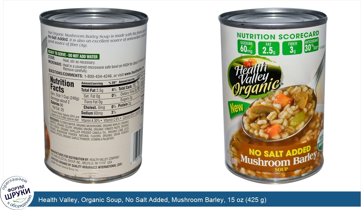 Health Valley, Organic Soup, No Salt Added, Mushroom Barley, 15 oz (425 g)