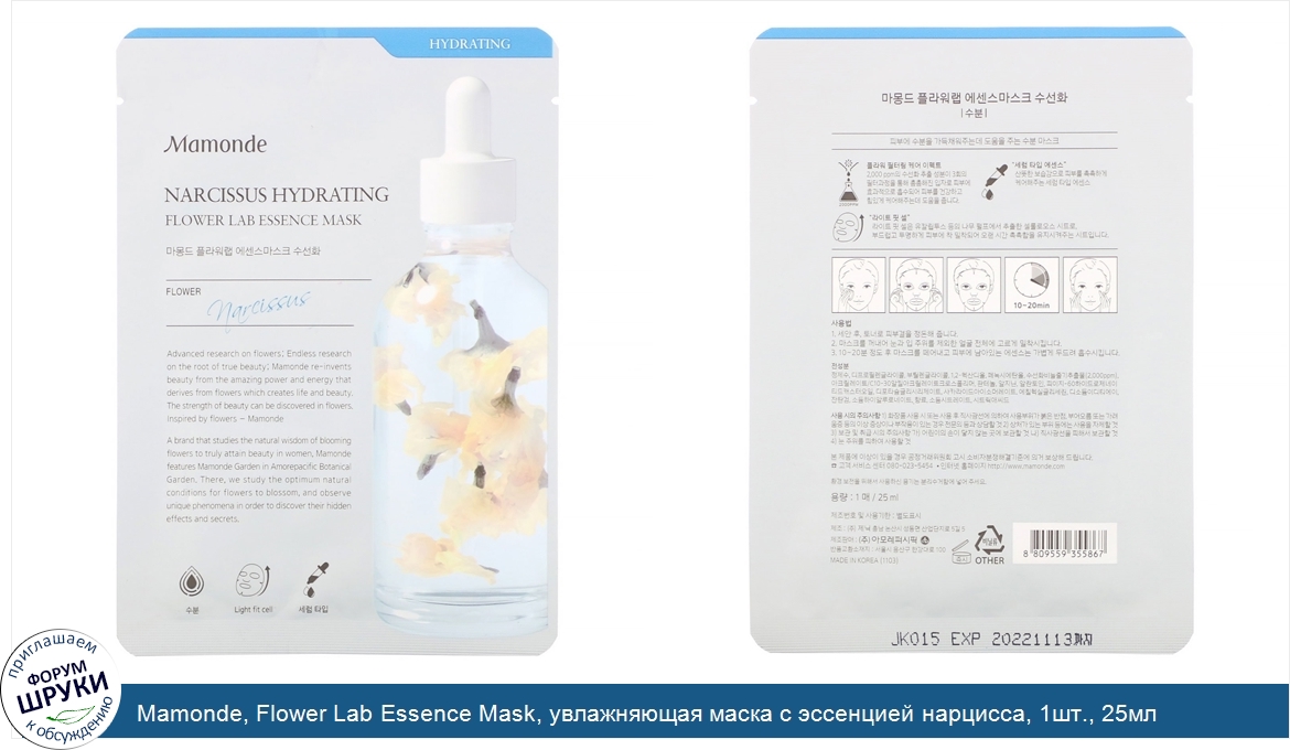 Mamonde, Flower Lab Essence Mask, увлажняющая маска с эссенцией нарцисса, 1шт., 25мл