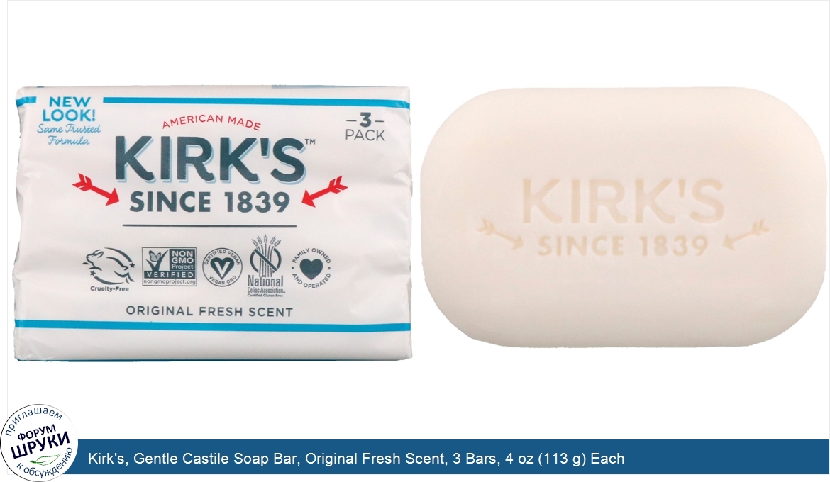 Kirk's, Gentle Castile Soap Bar, Original Fresh Scent, 3 Bars, 4 oz (113 g) Each