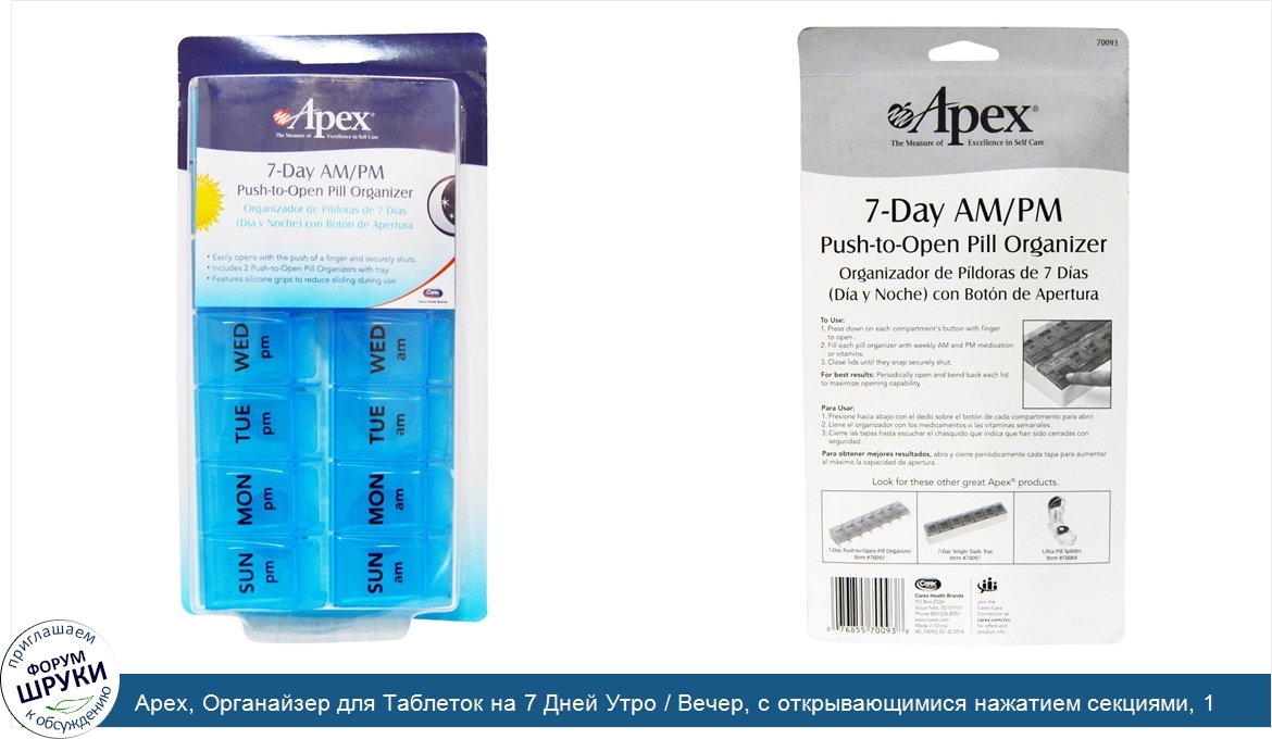 Друзья, если у вас есть отзыв/дополнение/комментарий/вопрос относительно Apex, Органайзер для Таблеток на 7 Дней Утро / Вечер, с открывающимися нажатием секциями, 1 органайзер - напишите его ответом в эту тему (это будет полезно всему сообществу в целом и вам в отдельности).