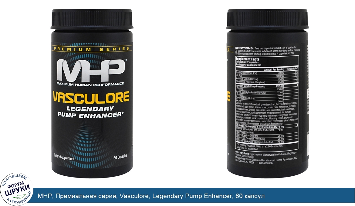 [DESCRIPT]Dietary Supplement. Official MHP Product. Manufactured in a GMP Compliant Facility. Driven by MHP Science. Reach Your Maximum Human Performance. Reach Your MHP with our exclusive Premium Series. Every product label tells you exactly what's in the bottle, so you know you're getting science-driven sports performance in every serving. Vasculore is scientifically designed and potently dosed to take your muscle pumps to a whole new level. The key ingredients in Vasculore work by potently boosting nitric oxide, the key signal in you veins that cause them to expand (dilate), thereby flooding your muscles with blood and creating a tight and full appearance, for a legendary pump. But you won't just look better - you'll perform better too. Vasculore enhances performance by rapidly boosting muscle ATP (energy) resulting in superior strength gains and muscle growth, and can even help reduce the signs and symptoms of over training. Are you ready to be Vasculore? . elevATP - Shown to Boost Muscle ATP for Greater Strength, Hypertrophy and Faster Recovery. Spectra L-Citrulline - Accelerates Blood Flow, Nitric Oxide Muscle Volume. Sodium Potassium - Added Electrolytes for Great Muscle Hydration, Function Performance.[/DESCRIPT]... (описание дополняется)
