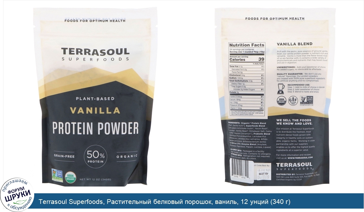 [DESCRIPT]Food for Optimum Health. Plant-Based. Grain-Free. 50% Protein. Non-GMO Project Verified. USDA Organic. Gluten Free. Certified Organic by CCOF. Vanilla Blend - 100% Plant-Based Complete Protein. Rich with the exotic, pure essence of ground vanilla bean, our vanilla protein powder is nutrient-rich and versatile. Vanilla is more than the flavor boost most of us are familiar with; it contains a wide variety of phytochemicals and nutrients that may boost mood and aid in digestion. We Sell the Foods We Know and Love. Our mission at Terrasoul Superfoods is to distribute the freshest, most nutrient-dense foods grown with integrity in healthy soils on sustainable, organic farms. Working in close partnership with our suppliers enables us to offer the highest quality ingredients at a superior value. Quality Guarantee: We don't use any "natural" flavorings. Our protein powders are created with 100% pure superfood ingredients. No artificial anything and no compromises.[/DESCRIPT]... (описание дополняется)