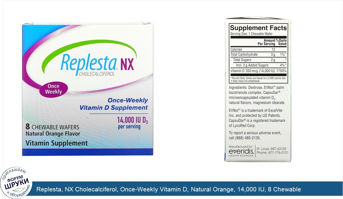Друзья, если у вас есть отзыв/дополнение/комментарий/вопрос относительно Replesta, NX Cholecalciferol, Once-Weekly Vitamin D, Natural Orange, 14,000 IU, 8 Chewable Wafers - напишите его ответом в эту тему (это будет полезно всему сообществу в целом и вам в отдельности).