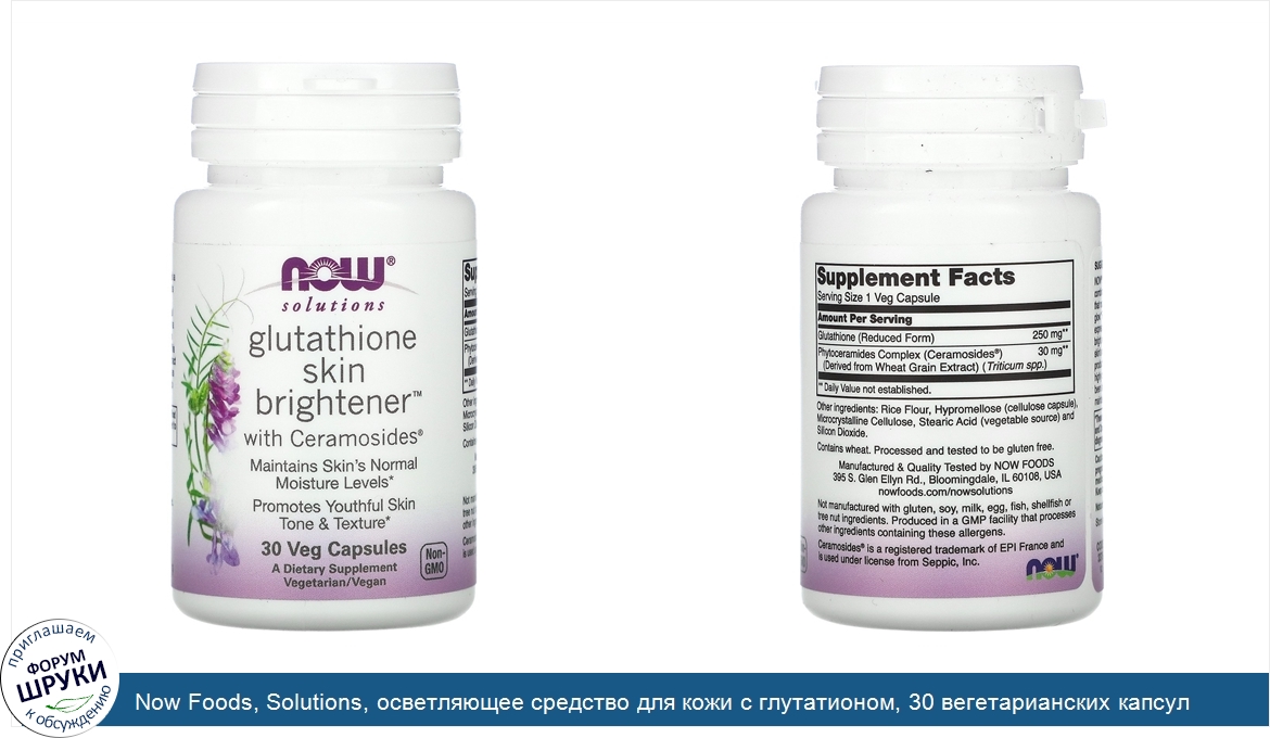 [DESCRIPT]With Ceramosides. Maintains Skin's Normal Moisture Levels. Promotes Youthful Skin Tone Texture. A Dietary Supplement. Vegetarian/Vegan. NOW solutions Glutathione Skin Brightener is a combination of two clinically validated ingredients that nourish from within to give skin a healthy glow. First, glutathione helps to maintain normal expression of skins pigment, which can result in a bright an even skin tone, and helps to maintain skin's natural moisture content and elasticity. This product also features ceramosides, a plant extract highly concentrated in phytoceramides, which has been shown to moisturize skin from within and to maintain youthful skin appearance.[/DESCRIPT]... (описание дополняется)