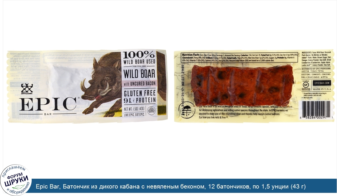 Друзья, если у вас есть отзыв/дополнение/комментарий/вопрос относительно Epic Bar, Батончик из дикого кабана с невяленым беконом, 12 батончиков, по 1,5 унции (43 г) каждый - напишите его ответом в эту тему (это будет полезно всему сообществу в целом и вам в отдельности).