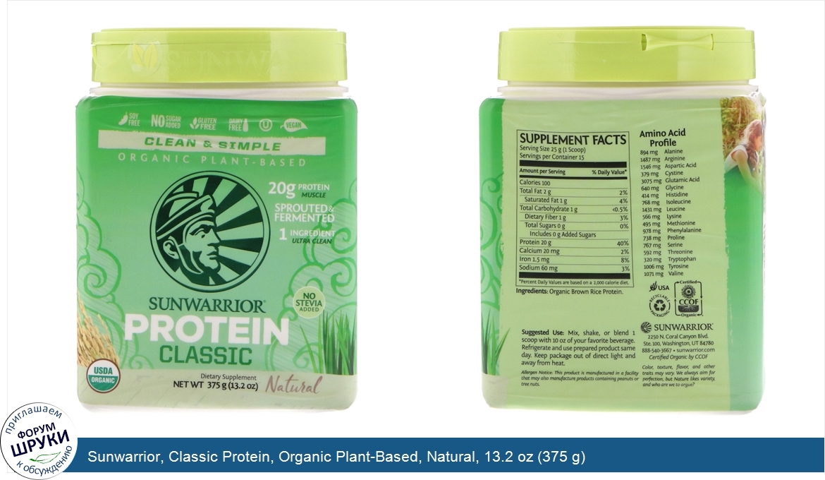 [DESCRIPT]Soy Free. No Sugar Added. Gluten Free. Dairy Free. Kosher. Vegan. Clean Simple. 20 g Protein (Muscle). Sprouted Fermented. 1 Ingredients (Ultra Clean). USDA Organic. No Stevia Added. Dietary Supplement. Certified Organic by CCOF. A Raw Superfood Company. Simple, Clean Ingredients. Easy on Digestion. Whole Grain Brown Rice Protein. Low Glycemic Index. Sunwarrior is committed to making the best plant-based proteins and superfood supplements. Our mission to illuminate body, mind, and planet drives everything we do from sourcing the finest organic ingredients across the globe. It's who we are. From The Conscious Warrior. Simply Whole Grain Brown Rice. Transformed by active enzymes, Classic is gentle, eco-friendly, earthy, yet strong. Relying one renewable protein source, this is allergen-friendly nutrition in its purest form, but don't expect the gentle nature of brown rice to lead to meek results applied to your active life. Being a connoisseur of simplicity doesn't mean you don't demand the absolute most from your body or your food. Classic won't disappoint, delivering plenty of protein and balanced amino acids for Conscious Warriors with active lives![/DESCRIPT]... (описание дополняется)