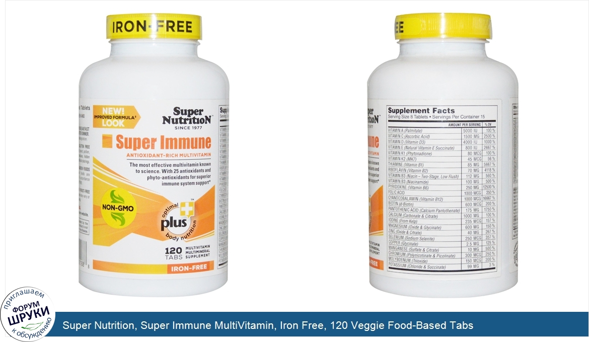Друзья, если у вас есть отзыв/дополнение/комментарий/вопрос относительно Super Nutrition, Super Immune MultiVitamin, Iron Free, 120 Veggie Food-Based Tabs - напишите его ответом в эту тему (это будет полезно всему сообществу в целом и вам в отдельности).