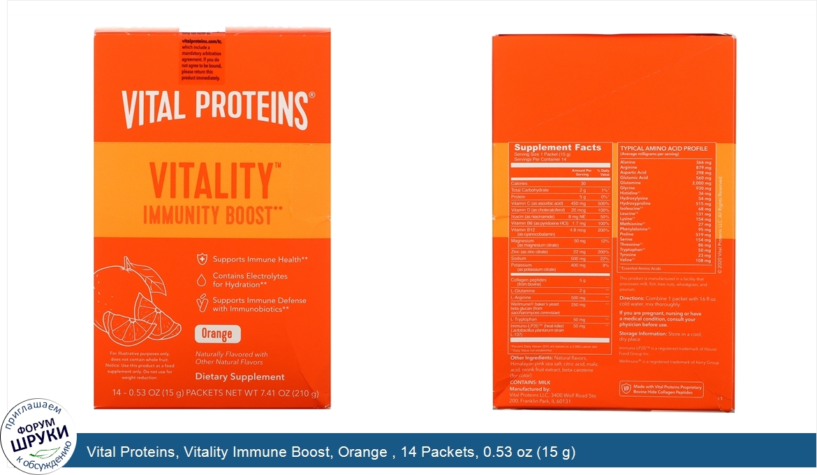 Друзья, если у вас есть отзыв/дополнение/комментарий/вопрос относительно Vital Proteins, Vitality Immune Boost, Orange , 14 Packets, 0.53 oz (15 g) - напишите его ответом в эту тему (это будет полезно всему сообществу в целом и вам в отдельности).