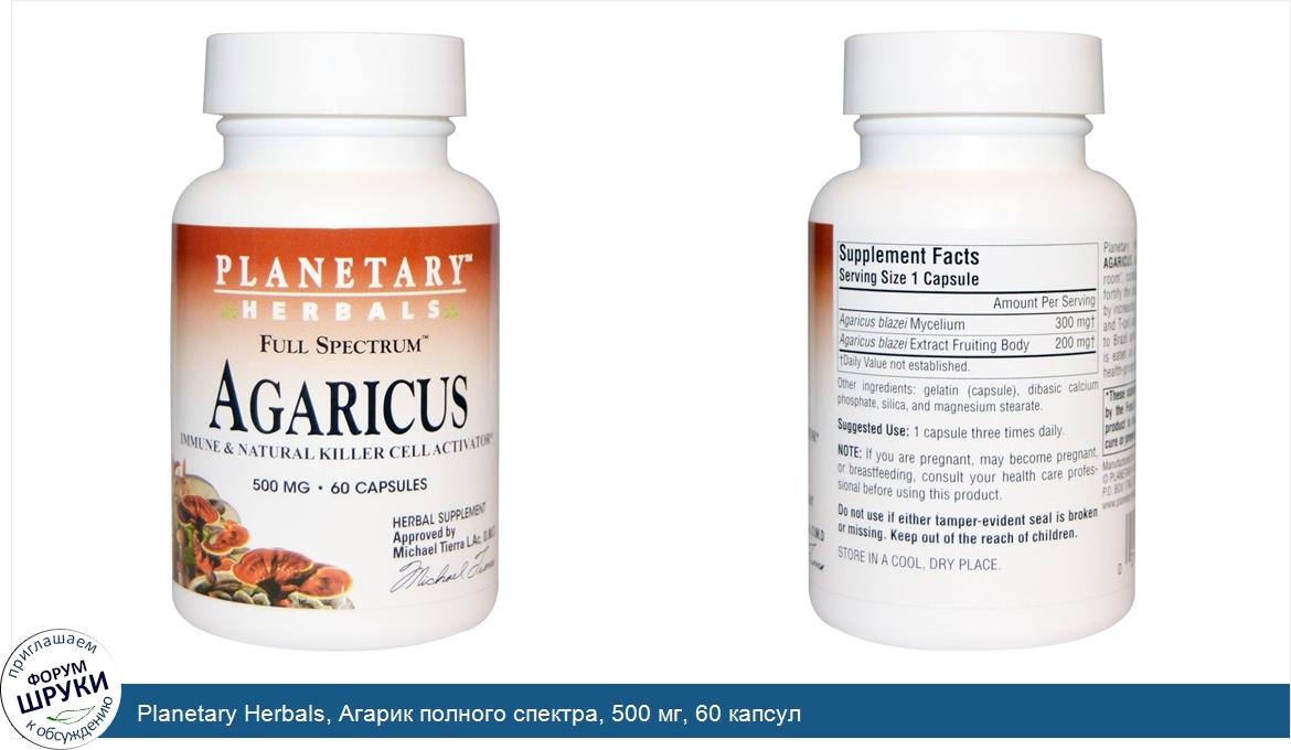 Активатор иммунитета и белых кровяных телец. Травяная добавка. Одобрено доктором Майклом Тьерра, L.Ac, O.M.D. Агарик полного спектра от Planetary Herbals (другое название - "солнечный гриб") содержит полисахариды...