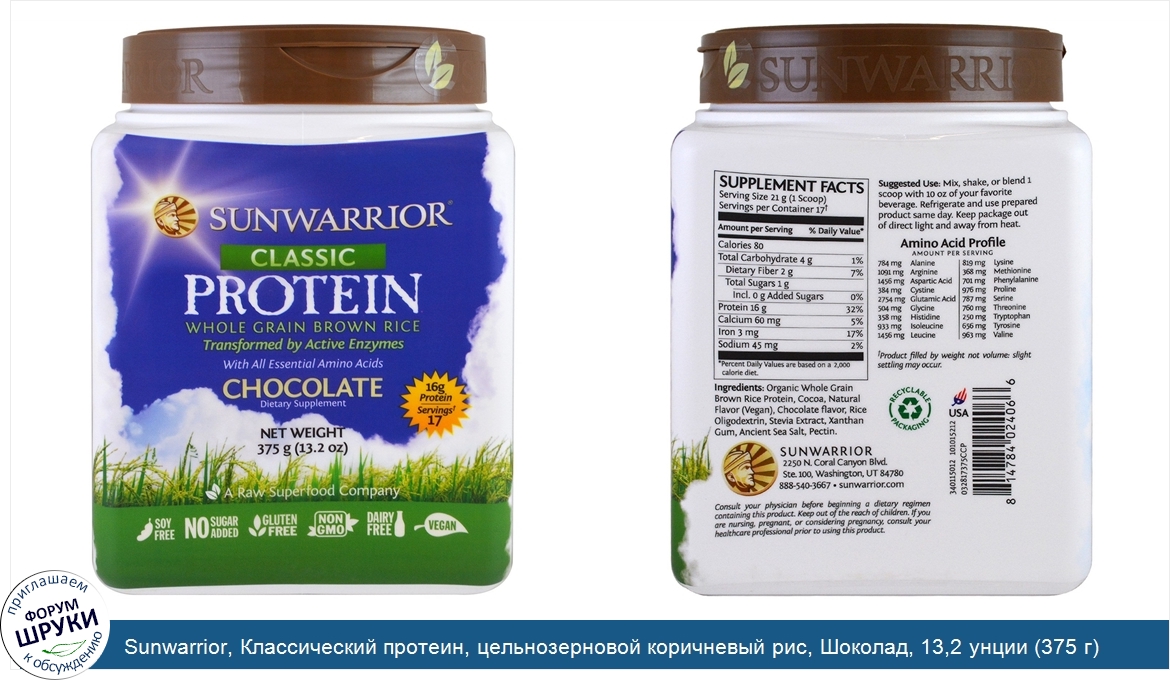 Друзья, если у вас есть отзыв/дополнение/комментарий/вопрос относительно Sunwarrior, Классический протеин, цельнозерновой коричневый рис, Шоколад, 13,2 унции (375 г) - напишите его ответом в эту тему (это будет полезно всему сообществу в целом и вам в отдельности).