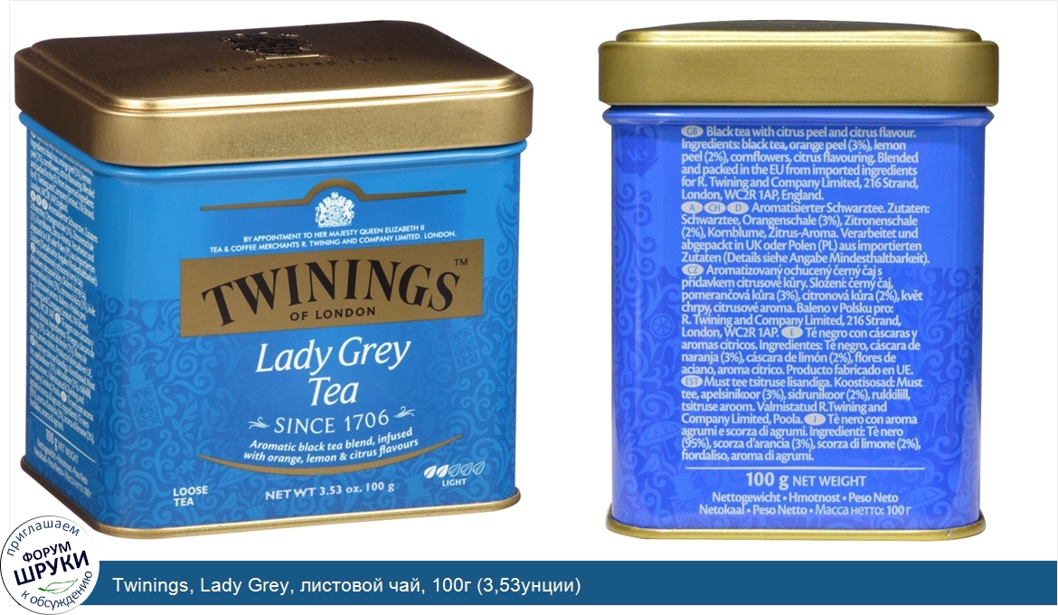 [DESCRIPT]Established 1706. Aromatic Black Tea Blend, Infused with Orange, Lemon Citrus Flavors. Loose Tea. Light. Sourced with Care. Lady Grey is offered exclusively from Twinings. This light black tea is perfectly balanced with the citrus fruit flavours of bergamot, orange and lemon to deliver a delightful tea with a refreshing taste and uplifting aroma.[/DESCRIPT]... (описание дополняется)