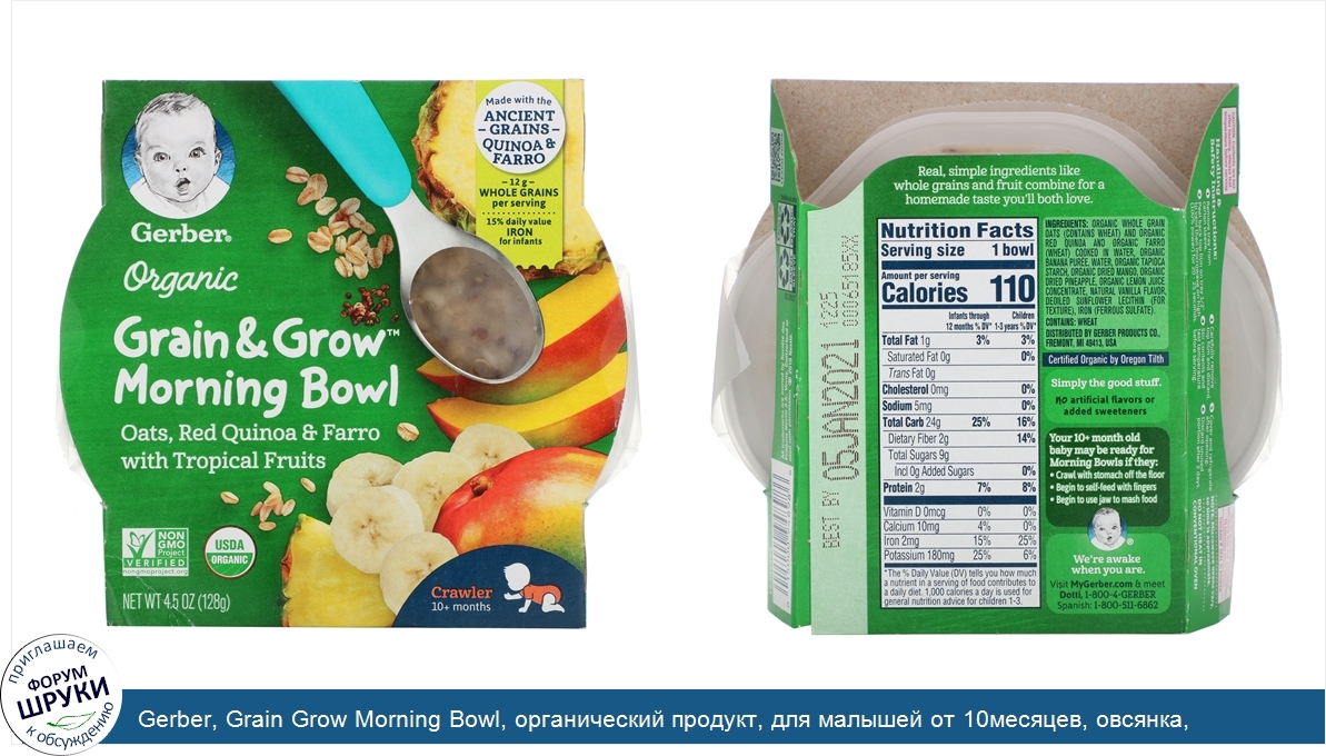 ru Gerber, Grain Grow Morning Bowl, органический продукт, для малышей от 10месяцев, овсянка, красное киноа и полба с тропическими фруктами, 128г...
