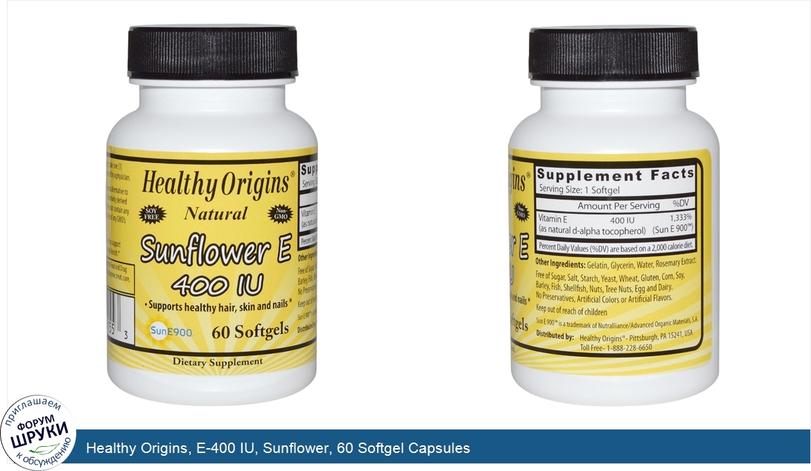 [DESCRIPT]Soy Free. Natural. Non-GMO. Supports Healthy Hair, Skin and Nails. SunE900. Dietary Supplement. Healthy Origins Sunflower E-400 IU is a great alternative to traditional Vitamin E supplements which are commonly derived from GMO Soy. Vitamin E from sunflower oil does not contain any major food allergens and is guaranteed to be free of any GMO’s (genetically modified organisms). Healthy Origins Sunflower E-400 IU may help support cardiovascular health as well as hair, skin and nail health.[/DESCRIPT]... (описание дополняется)
