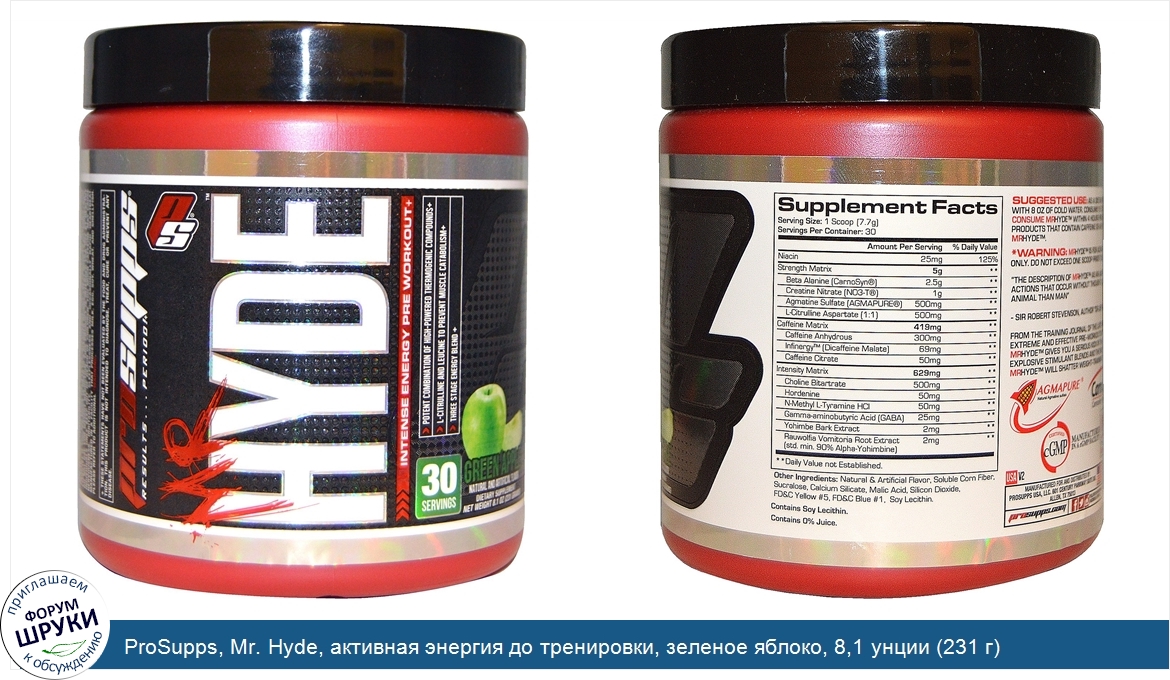 Друзья, если у вас есть отзыв/дополнение/комментарий/вопрос относительно ProSupps, Mr. Hyde, активная энергия до тренировки, зеленое яблоко, 8,1 унции (231 г) - напишите его ответом в эту тему (это будет полезно всему сообществу в целом и вам в отдельности).