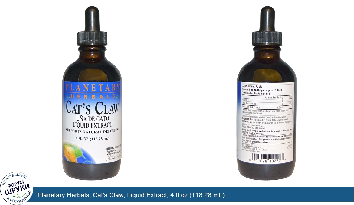 Друзья, если у вас есть отзыв/дополнение/комментарий/вопрос относительно Planetary Herbals, Cat's Claw, Liquid Extract, 4 fl oz (118.28 mL) - напишите его ответом в эту тему (это будет полезно всему сообществу в целом и вам в отдельности).