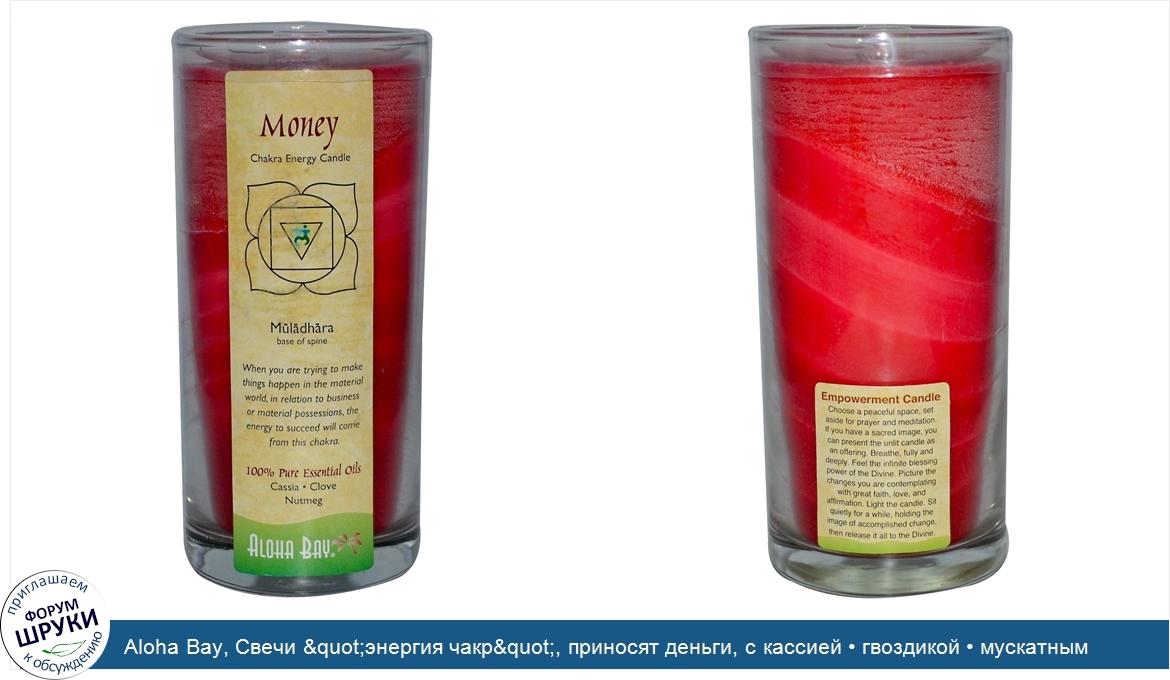 Друзья, если у вас есть отзыв/дополнение/комментарий/вопрос относительно Aloha Bay, Свечи "энергия чакр", приносят деньги, с кассией • гвоздикой • мускатным орехом, 11 унций - напишите его ответом в эту тему (это будет полезно всему сообществу в целом и вам в отдельности).