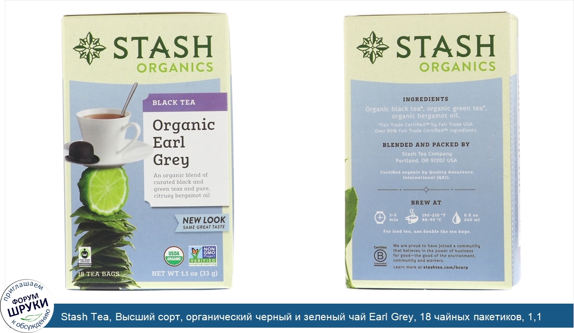 [DESCRIPT]Estd 1972. USDA Organic. Non GMO Project Verified. Certified B Corporation. Kosher Parve. Certified Organic by Quality Assurance International. Open To Bring Your Taste Buds to Life. Open. Sip. Smile. Repeat. An organic blend of curated black and green teas and pure, citrusy bergamot oil. - Black Tea -. A luxurious blend of organic black and green teas and pure bergamot oil. The warm, sunny hills of Calabria, Italy produce the world's best bergamot fruit, giving our Organic Earl Grey a naturally bright, intense flavor that's sure to delight. Explore. -. Our. -. World of Tea. At stash, we aren't just makers of tea, we're tea people. We carefully select our organic teas, herbs and spices to meet our exacting standards to bring you the most flavorful, all-natural organic tea blends. Yet we believe in more than just creating great teas. We partner with farmers and suppliers who share our priorities of quality, environmental stewardship, and progressive human rights. Together, we strive to create a more sustainable future for our local and global communities. Tea is in our soul, and we exist to share that dedication in every cup.[/DESCRIPT]... (описание дополняется)