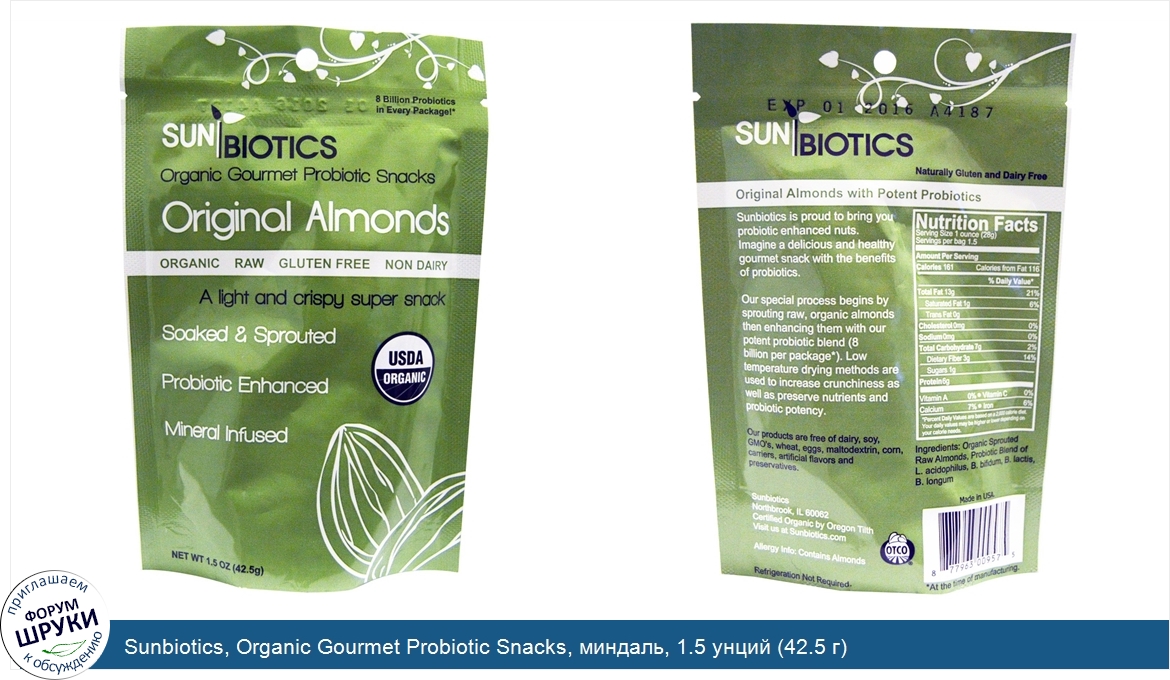 Друзья, если у вас есть отзыв/дополнение/комментарий/вопрос относительно Sunbiotics, Organic Gourmet Probiotic Snacks, миндаль, 1.5 унций (42.5 г) - напишите его ответом в эту тему (это будет полезно всему сообществу в целом и вам в отдельности).