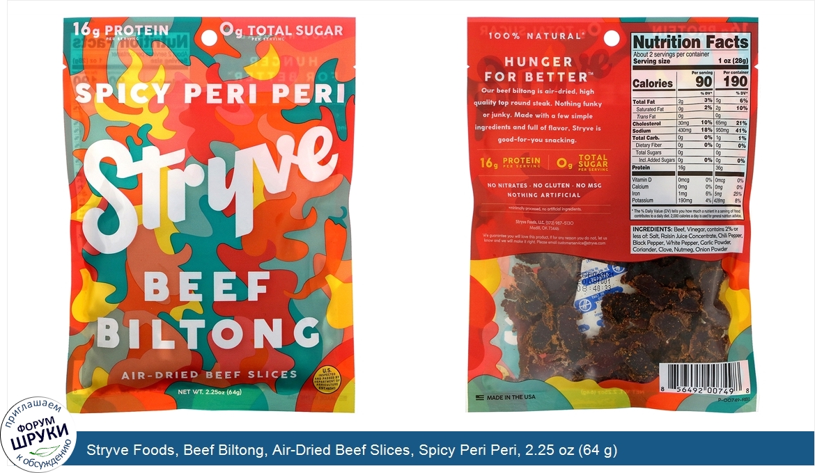 [DESCRIPT]16 g Protein Per Serving. 0 g Total Sugar Per Serving. U.S. Inspected and Passed By Department of Agriculture Est. 46541. 100% Natural*. Hunger for Better. ™. No Nitrates. No Gluten. No MSG. Nothing Artificial. Our beef biltong is air-dried, high quality top round steak. Nothing funky or junky. Made with a few simple ingredients and full of flavor, Stryve is good-for-you snacking. *Minimally processed, no artificial ingredients[/DESCRIPT]... (описание дополняется)
