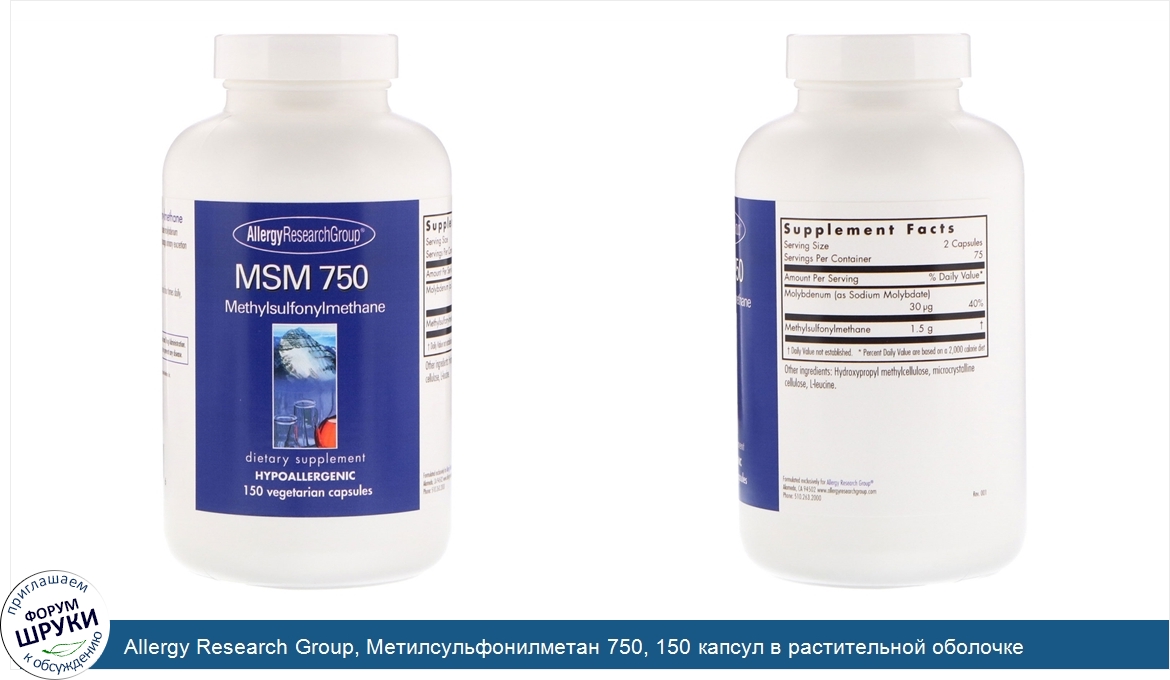 Друзья, если у вас есть отзыв/дополнение/комментарий/вопрос относительно Allergy Research Group, Метилсульфонилметан 750, 150 капсул в растительной оболочке - напишите его ответом в эту тему (это будет полезно всему сообществу в целом и вам в отдельности).