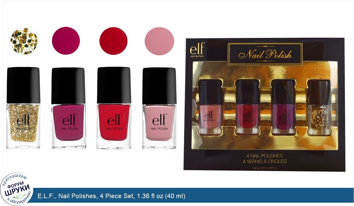 Друзья, если у вас есть отзыв/дополнение/комментарий/вопрос относительно E.L.F., Nail Polishes, 4 Piece Set, 1.36 fl oz (40 ml) - напишите его ответом в эту тему (это будет полезно всему сообществу в целом и вам в отдельности).