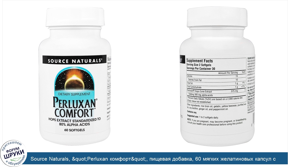 [DESCRIPT]Dietary Supplement. Hops Extract Standardized to 80% Alpha Acids. Source Naturals Perluxan Comfort softgels provide hops extract standardized to 80% naturally occurring alpha-acids, used traditionally to support health and comfort. Hops have been cultivated by humans for over a thousand years. While famous for being a major ingredient in brewing beer, hops have also been traditionally used by European herbalists and the Eclectic herbal practitioners of North America.[/DESCRIPT]... (описание дополняется)