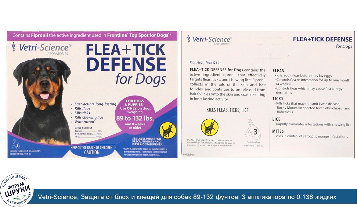 Друзья, если у вас есть отзыв/дополнение/комментарий/вопрос относительно Vetri-Science, Защита от блох и клещей для собак 89-132 фунтов, 3 аппликатора по 0.136 жидких унций каждый - напишите его ответом в эту тему (это будет полезно всему сообществу в целом и вам в отдельности).