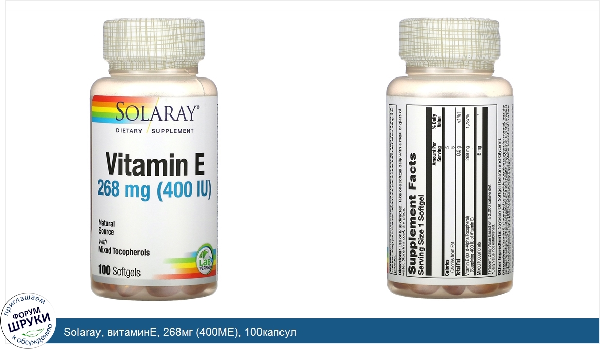 Solaray, витаминE, 268мг (400МЕ), 100капсул