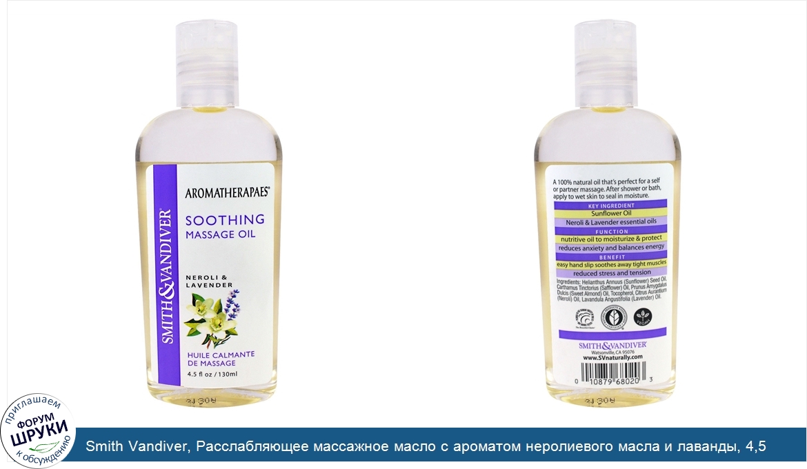 Друзья, если у вас есть отзыв/дополнение/комментарий/вопрос относительно Smith Vandiver, Расслабляющее массажное масло с ароматом неролиевого масла и лаванды, 4,5 жидкой унции (130 мл) - напишите его ответом в эту тему (это будет полезно всему сообществу в целом и вам в отдельности).