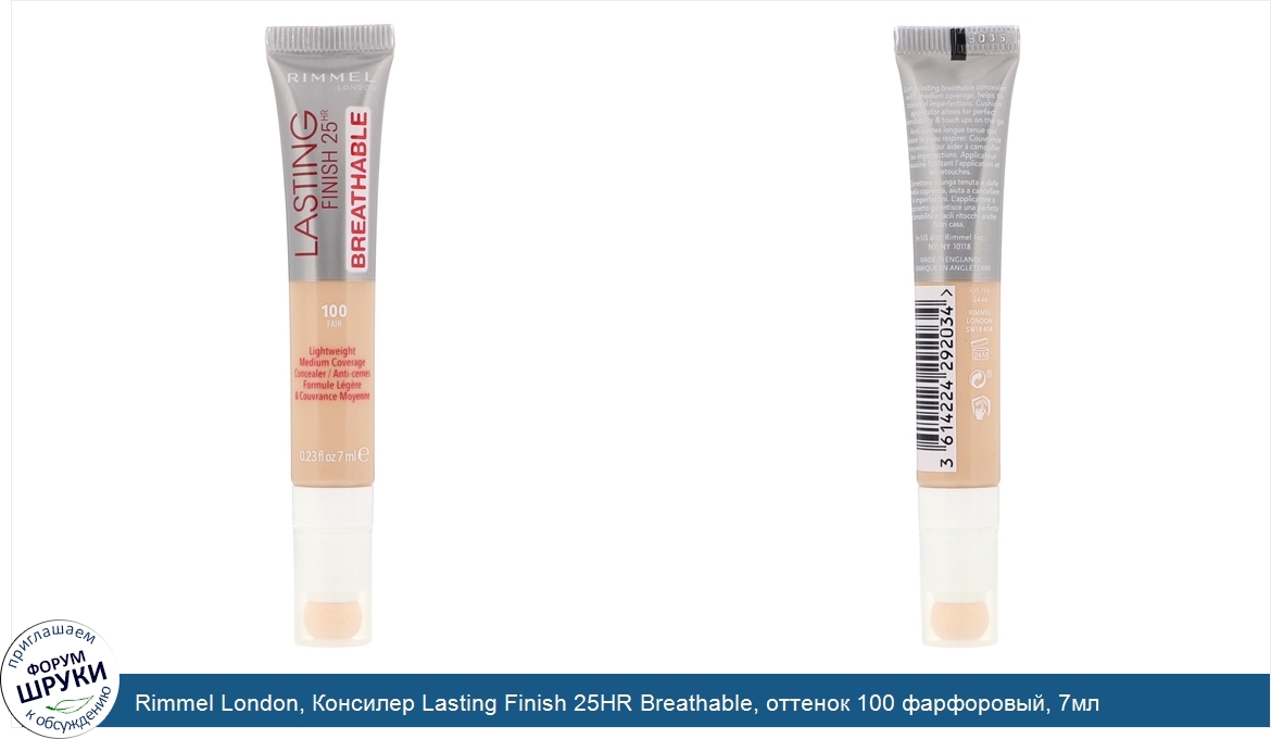 Rimmel London, Консилер Lasting Finish 25HR Breathable, оттенок 100 фарфоровый, 7мл