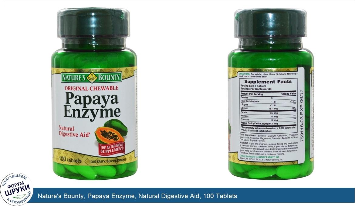 Друзья, если у вас есть отзыв/дополнение/комментарий/вопрос относительно Nature's Bounty, Papaya Enzyme, Natural Digestive Aid, 100 Tablets - напишите его ответом в эту тему (это будет полезно всему сообществу в целом и вам в отдельности).