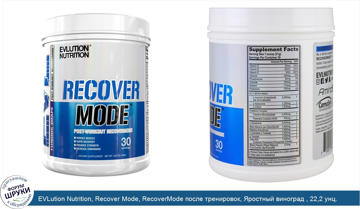 Друзья, если у вас есть отзыв/дополнение/комментарий/вопрос относительно EVLution Nutrition, Recover Mode, RecoverMode после тренировок, Яростный виноград , 22,2 унц. (630 г) - напишите его ответом в эту тему (это будет полезно всему сообществу в целом и вам в отдельности).
