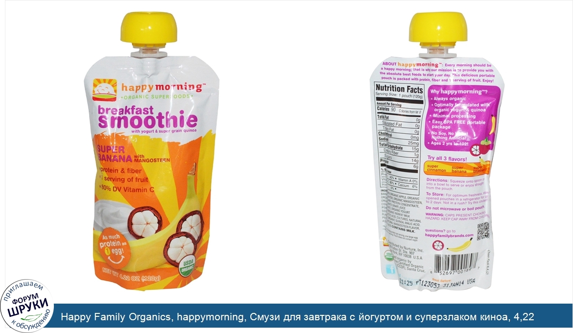 Друзья, если у вас есть отзыв/дополнение/комментарий/вопрос относительно Happy Family Organics, happymorning, Смузи для завтрака с йогуртом и суперзлаком киноа, 4,22 унции (120 г) - напишите его ответом в эту тему (это будет полезно всему сообществу в целом и вам в отдельности).