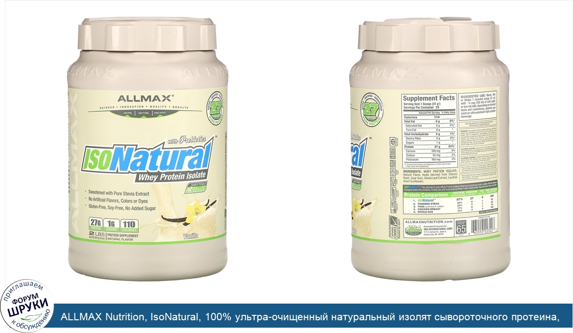 Друзья, если у вас есть отзыв/дополнение/комментарий/вопрос относительно ALLMAX Nutrition, IsoNatural, 100% ультра-очищенный натуральный изолят сывороточного протеина, со вкусом ванили, 907 г - напишите его ответом в эту тему (это будет полезно всему сообществу в целом и вам в отдельности).