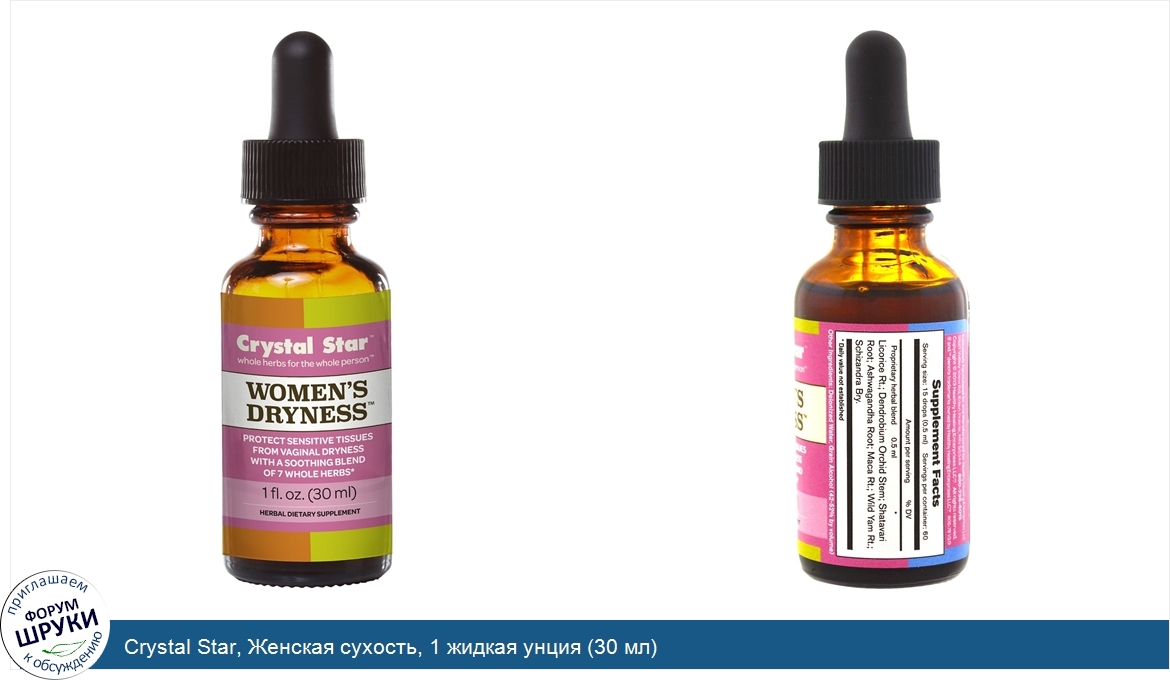 Друзья, если у вас есть отзыв/дополнение/комментарий/вопрос относительно Crystal Star, Женская сухость, 1 жидкая унция (30 мл) - напишите его ответом в эту тему (это будет полезно всему сообществу в целом и вам в отдельности).