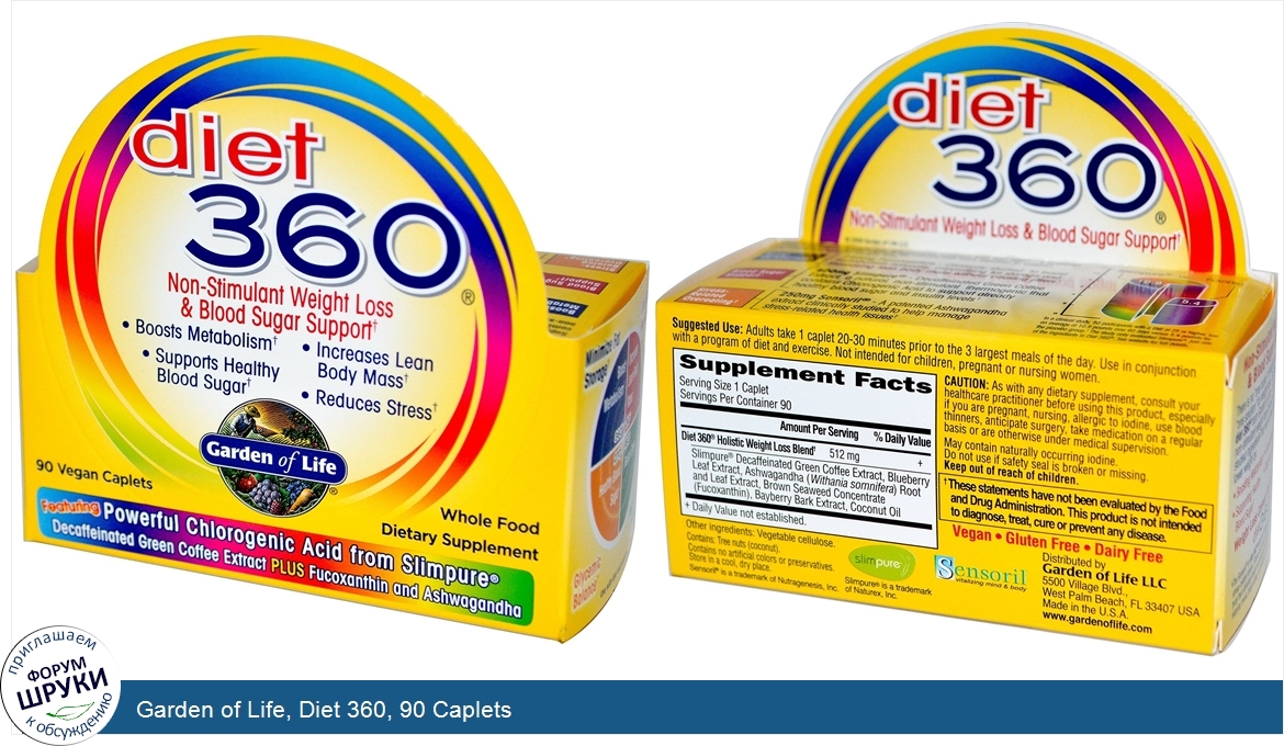 [DESCRIPT]Non-Stimulant Weight Loss Blood Sugar Support. Boosts Metabolism. Supports Healthy Blood Sugar. Increases Lean Body Mass. Reduces Stress. Whole Food Dietary Supplement. Slimpure. Sensoril Vitalizing Mind Body. Featuring Powerful Chlorogenic Acid from Slimpure Decaffeinated Green Coffee Extract Plus Fucoxanthin and Ashwaganda. Supplement your healthy diet and exercise program with diet 360 - a powerful combination of clinically studied ingredients that work together to support non-stimulant, healthy weight loss. Boost Metabolism. -. 240mg Fucoxanthin. - Clinically studies to boost metabolism naturally, minimizing fat storage and increasing lean body mass without causing jitters. Blood Sugar Support- 400mg Slimpure. - Decaffeinated Green Coffee Extract, a natural, non-stimulant thermogenic that contains Chlorogenic Acid to support already healthy blood sugar and insulin levels. Stress- Related Overeating- 250 mg Sensoril. -A patented Ashwagandha extract clinically studied to help manage stress-related health issues. Minimize Fat Storage. - Boost Metabolism 360°. Look Good Feel Great-. Increase Lean Body Mass 90°. Glycemic Balance-. Healthy Blood Sugar. Helps Fight Cravings♦-. Reduce Stress. ♦The Sensoril in diet 360 helps you manage stress and stress-related issues. Stress can cause a biological response in the body that ultimately leads to occasion loss of sleep, general irritability, skipping meals, binge eating, carb loading and other challenges. Non-Stimulant Weight Loss Blood Sugar Support. There is no "one cause" of weight gain. There is no "one solution" for weight loss. Go Holistic. with diet 360 from Garden of Life- A multidimensional, non-stimulant weight loss formula with clinically studied ingredients that work synergistically to help lower weight by: . Boosting Metabolism. Supporting Health Blood Sugar. Increasing Lean Body Mass. Reducing Stress.[/DESCRIPT]... (описание дополняется)