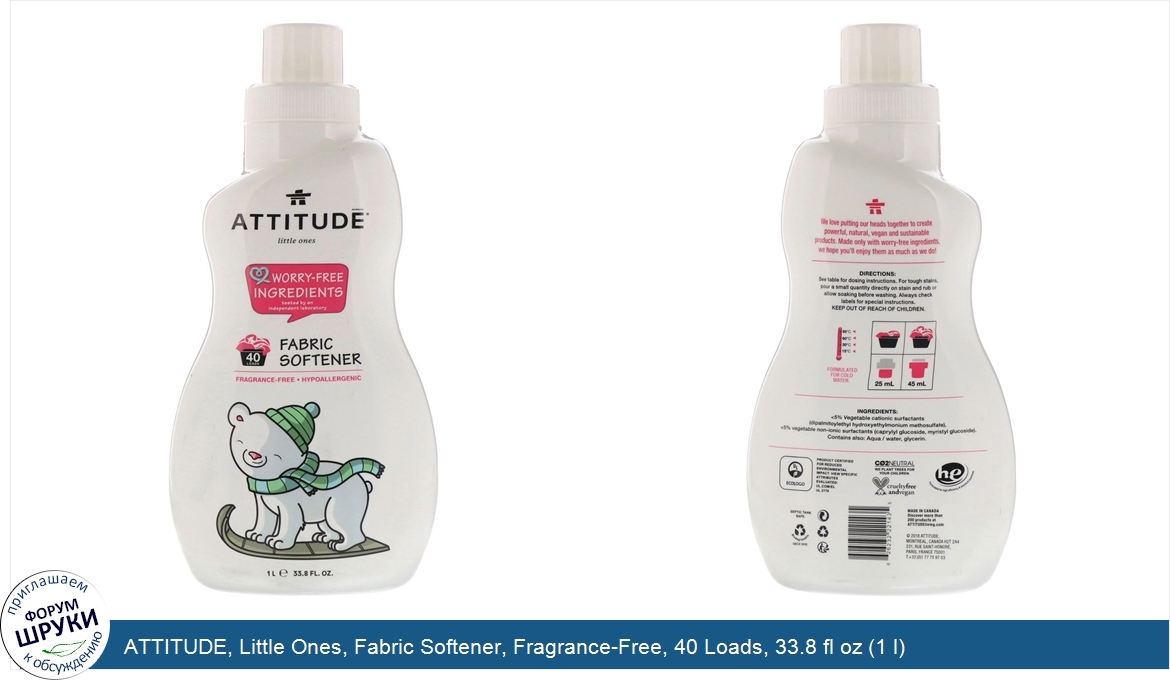 Друзья, если у вас есть отзыв/дополнение/комментарий/вопрос относительно ATTITUDE, Little Ones, Fabric Softener, Fragrance-Free, 40 Loads, 33.8 fl oz (1 l) - напишите его ответом в эту тему (это будет полезно всему сообществу в целом и вам в отдельности).