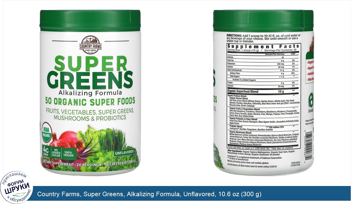 Друзья, если у вас есть отзыв/дополнение/комментарий/вопрос относительно Country Farms, Super Greens, Alkalizing Formula, Unflavored, 10.6 oz (300 g) - напишите его ответом в эту тему (это будет полезно всему сообществу в целом и вам в отдельности).