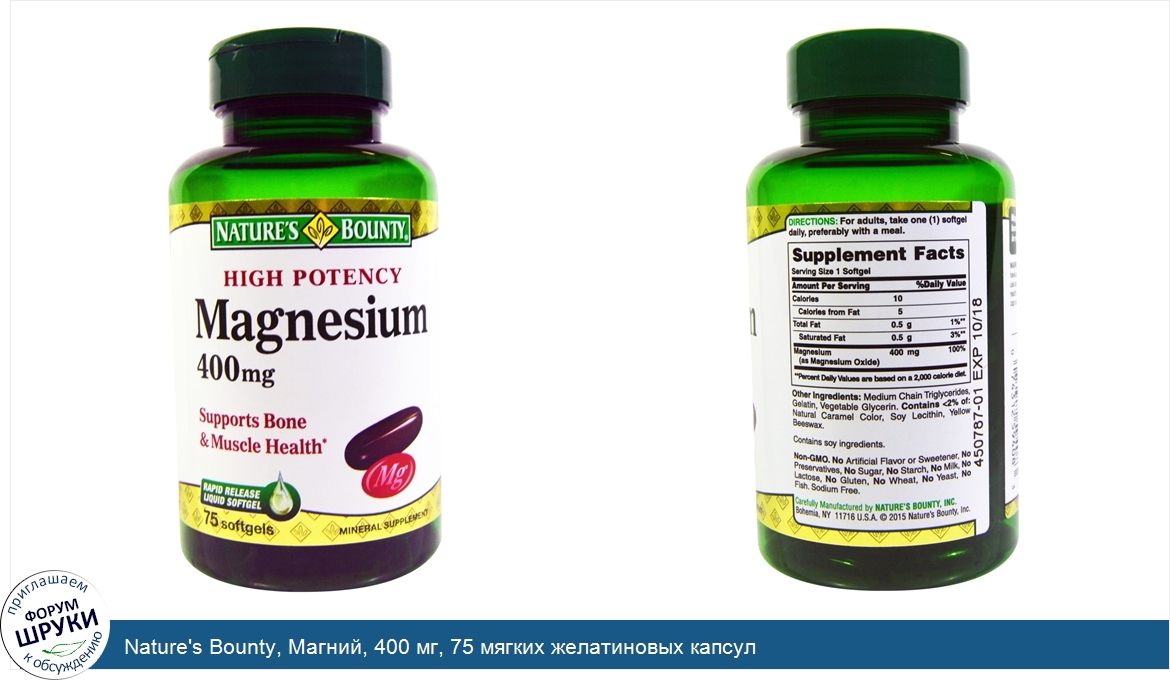 Друзья, если у вас есть отзыв/дополнение/комментарий/вопрос относительно Nature's Bounty, Магний, 400 мг, 75 мягких желатиновых капсул - напишите его ответом в эту тему (это будет полезно всему сообществу в целом и вам в отдельности).