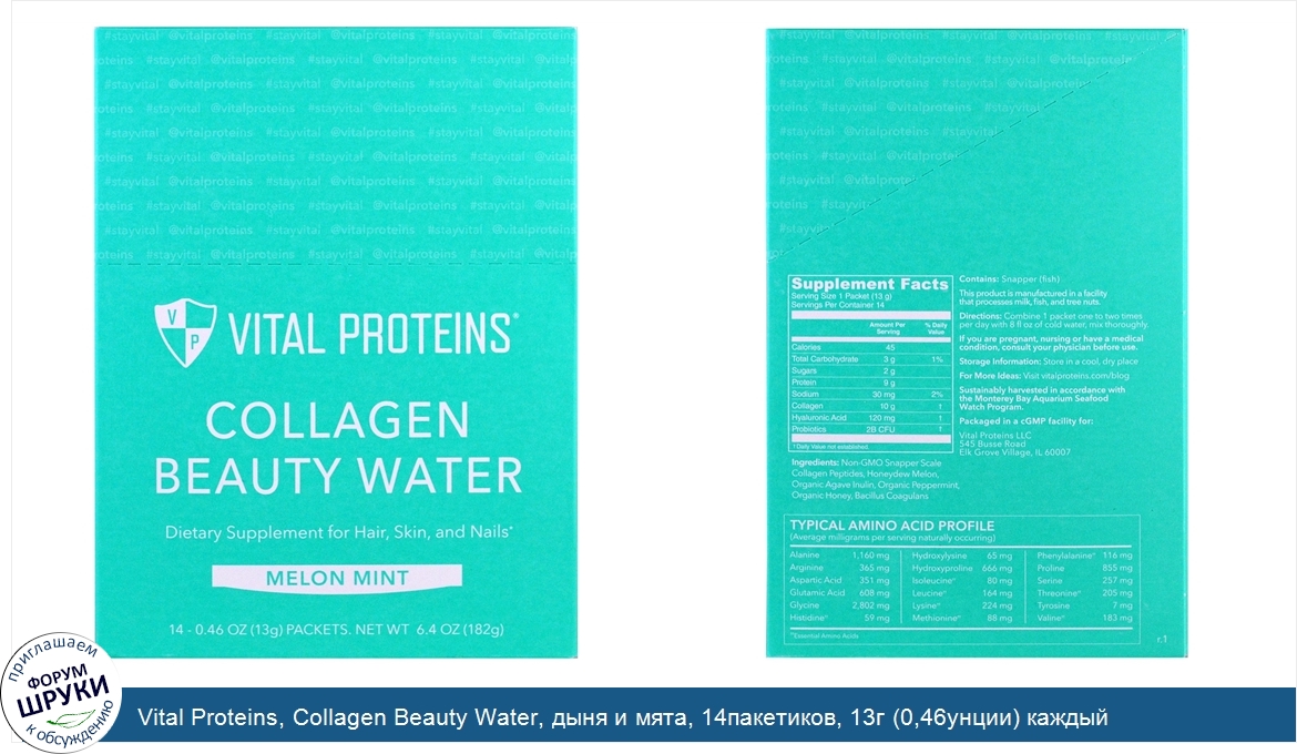 Друзья, если у вас есть отзыв/дополнение/комментарий/вопрос относительно Vital Proteins, Collagen Beauty Water, дыня и мята, 14пакетиков, 13г (0,46унции) каждый - напишите его ответом в эту тему (это будет полезно всему сообществу в целом и вам в отдельности).