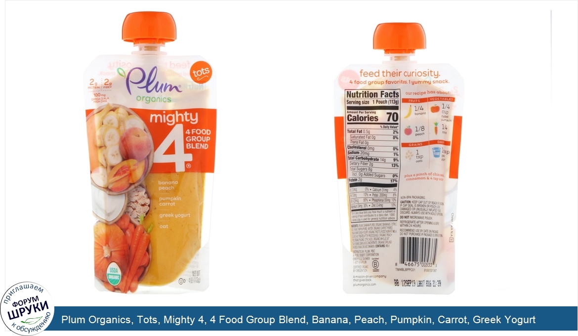 Друзья, если у вас есть отзыв/дополнение/комментарий/вопрос относительно Plum Organics, Tots, Mighty 4, 4 Food Group Blend, Banana, Peach, Pumpkin, Carrot, Greek Yogurt, Oat, 4 oz (113 g) - напишите его ответом в эту тему (это будет полезно всему сообществу в целом и вам в отдельности).