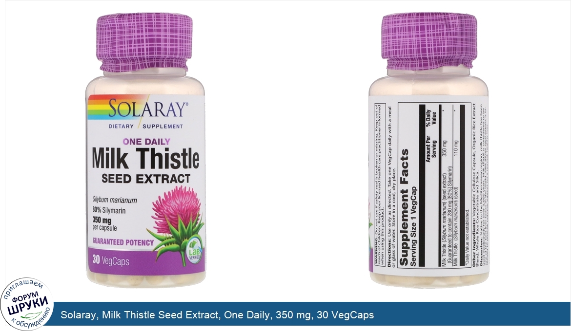 [DESCRIPT]Non-GMO. 100% Vegan. Silybum Marianum. 80% Silymarin. 350 . Silybum Marianum. 80% Silymarin. 350 . Dietary Supplement. Silybum Marianum. 80% Silymarin. 350 mg Per Capsule. Guaranteed Potency. Lab Verified. Native to the Mediterranean region, milk thistle has been used medicinally for over 3,000 years. Milk thistle is considered by many to be one of the best liver tonics in the world. Solaray Milk Thistle extract is intended to provide nutritive support for a normal, healthy liver.[/DESCRIPT]... (описание дополняется)