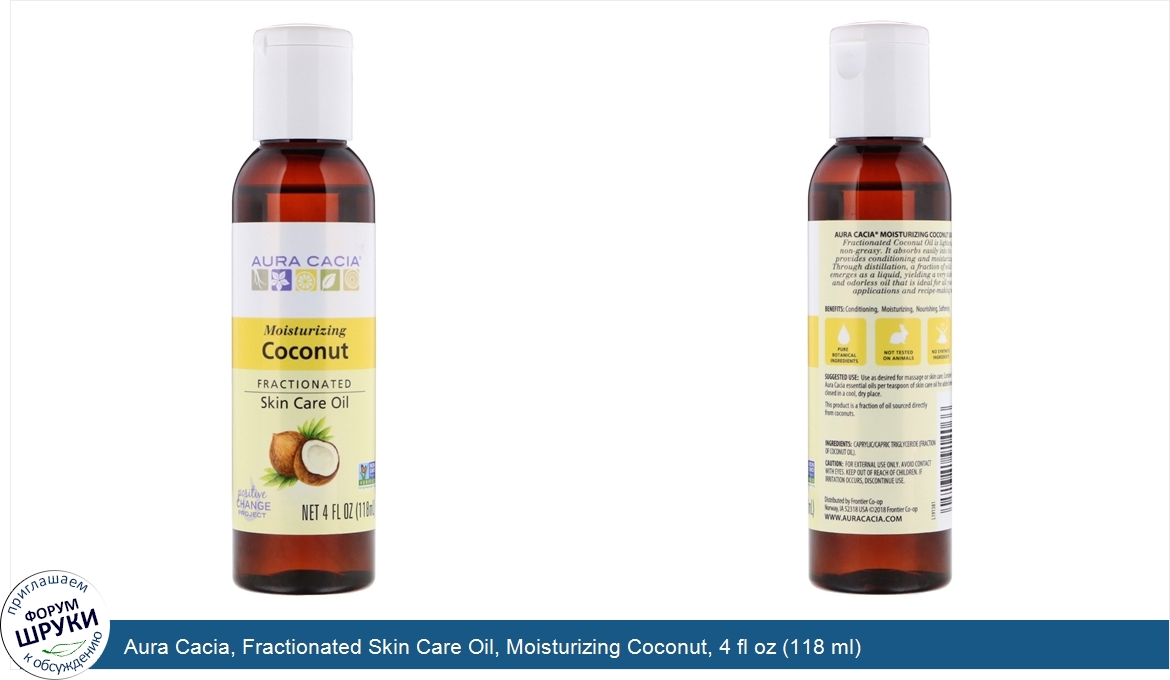 [DESCRIPT]Positive Change Project. Non-GMO Project Verified. Pure Botanical Ingredients. Not Tested On Animals. No Synthetic Ingredients. Petroleum-Free. Aura Cacia Moisturizing Coconut Skin Care Oil. Fractionated Coconut Oil is lightweight and non-greasy. It absorbs easily into the skin and provides conditioning and moisturizing benefits. Through distillation, a fraction of solid coconut oil emerges as a liquid, yielding a very stable, colorless and odorless oil that is ideal for all your body care applications and recipe-making needs. Benefits: Conditioning, Moisturizing, Nourishing, Softening.[/DESCRIPT]... (описание дополняется)