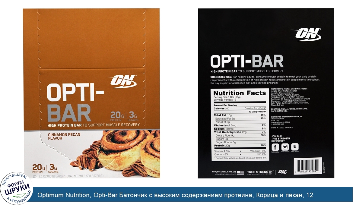 Друзья, если у вас есть отзыв/дополнение/комментарий/вопрос относительно Optimum Nutrition, Opti-Bar Батончик с высоким содержанием протеина, Корица и пекан, 12 батончиков, 2,1 унции (60 г) каждый - напишите его ответом в эту тему (это будет полезно всему сообществу в целом и вам в отдельности).