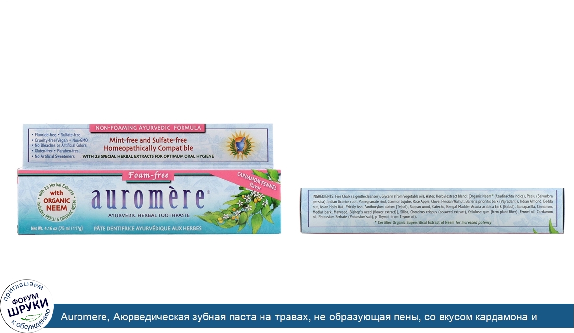 Друзья, если у вас есть отзыв/дополнение/комментарий/вопрос относительно Auromere, Аюрведическая зубная паста на травах, не образующая пены, со вкусом кардамона и фенхеля, 4,16 унции (117 г) - напишите его ответом в эту тему (это будет полезно всему сообществу в целом и вам в отдельности).