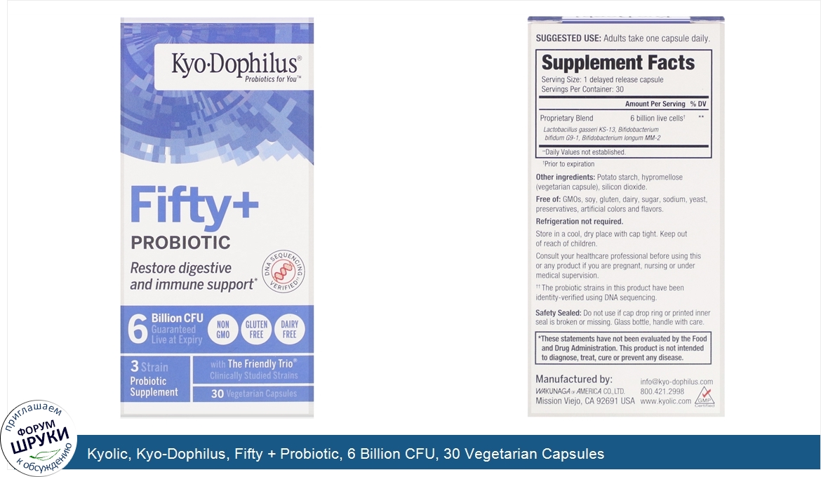 [DESCRIPT]Probiotics for You™. Restore Digestive and Immune Support. DNA Sequence Verified††. 6 Billion CFU Guaranteed Live at Expiry. Non GMO. Gluten Free. Dairy Free. 3 Strain Probiotic Supplement. With The Friendly Trio® Clinically Studied Strains. GMP Certified. A Probiotic You Can Count On. Kyo-Dophilus® Probiotics are formulated to support healthy digestive and immune systems. Our probiotics deliver efficacy, quality and extended live cell viability without refrigeration. The Friendly Trio® is the core of our formulations. The Friendly Trio is a clinically studied proprietary blend of human strain Lactobacillus gasseri KS-13, Bifidobacterium bifidum G9-1, and Bifidobacterium longum MM-2. L. gasseri has been shown to support your body's GI function and immune health. B. bifidum may regulate healthy gut flora and enhance immunity by reducing inflammation. B. longum is known to normalize bowel movements. Finding the right probiotic means considering more than CFU††† counts. Choose a probiotic with strains that are diverse, compatible and able to survive stomach acid, to encourage implantation and rapid replication in your gut. We offer a variety of formulas and potencies made with clinically proven strain to help meet your specific healthy needs. Your Gut Microbiome is as unique as you are. Kyo-Dophilus® Fifty + Probiotics was formulated with older adults in mind. As we age, changes to diet, activity levels, medication use and increased inflammation can cause the microflora of our GI system to diminish. Daily use of Fifty+Probiotic can help restore good bacteria and elevate immune system effectiveness. The three biocompatible human strains in Fifty+Probiotic, The Friendly Trio®, have been clinically studied to document the efficacy of these strains to support a healthy gut microbiome. The Fifty + Probiotic For You. To maintain good colon health. Relieve occasional digestive discomfort. Promote healthy immune function. Take one capsule of Kyo-Dophilus Fifty + every day to restore beneficial bacteria for a healthy GI and immune system to encourage general wellbeing. ††The probiotic strains in this product have been identify-verified using DNA sequencing. †††Colony Forming Units[/DESCRIPT]... (описание дополняется)